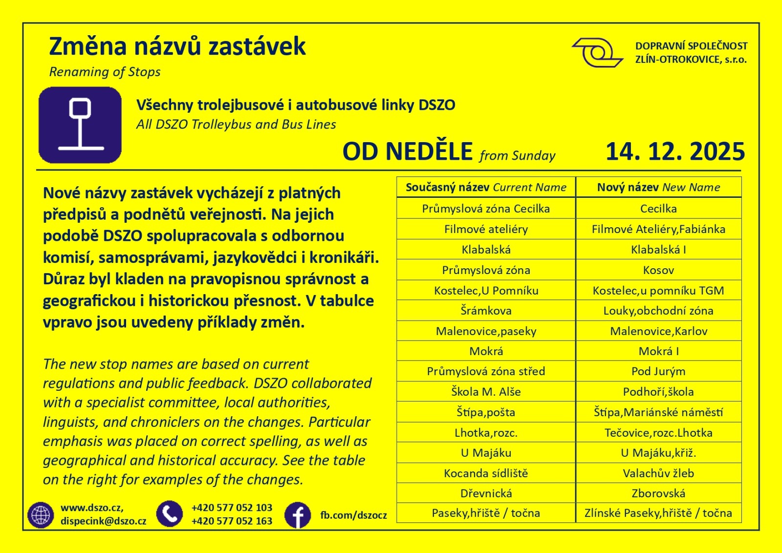 ZLÍN - Dopravní společnost Zlín-Otrokovice (DSZO) změní názvy 16 zastávek MHD. Důvodem je zpřesnění původních názvů, důraz na pravopisnou správnost a geografickou i historickou souvislost. Změny začnou platit v neděli 14. prosince s novým jízdním řádem.
